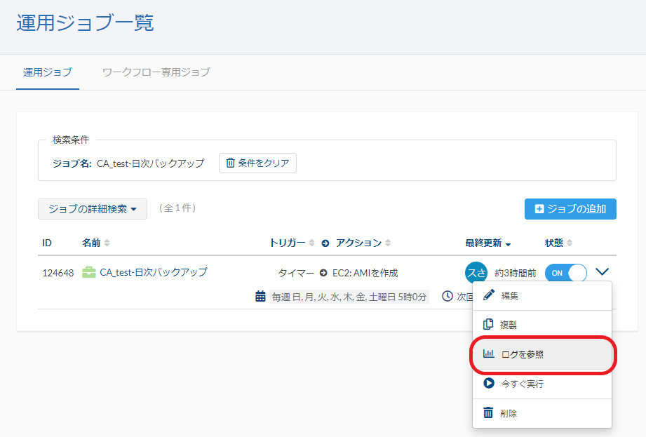 運用ジョブ一覧で対象のジョブを検索し、右側のプルダウンから「ログを参照」をクリックします。