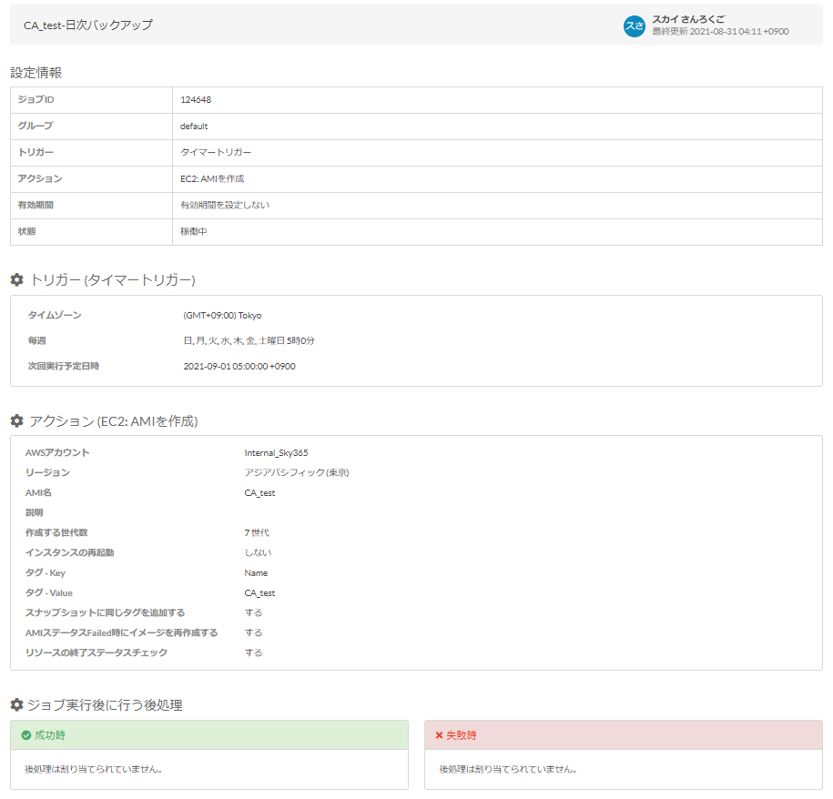 しばらくするとステータスが変化し、ジョブの実行結果、終了日時、作成されたAMIの情報を参照できます。