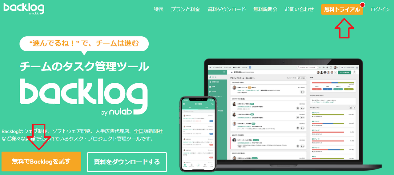 右上の「無料トライアル」または左下の「無料でBacklog」をクリックします。