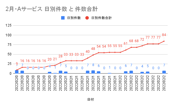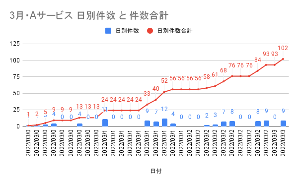 とあるサービスの2月と3月の「日別件数」と「累計」のグラフ📈です。