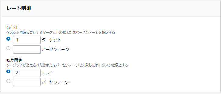 1個タスクが失敗したら強制終了、〇個タスクが失敗したら強制終了等、思ったより柔軟に設定変更が可能です。
